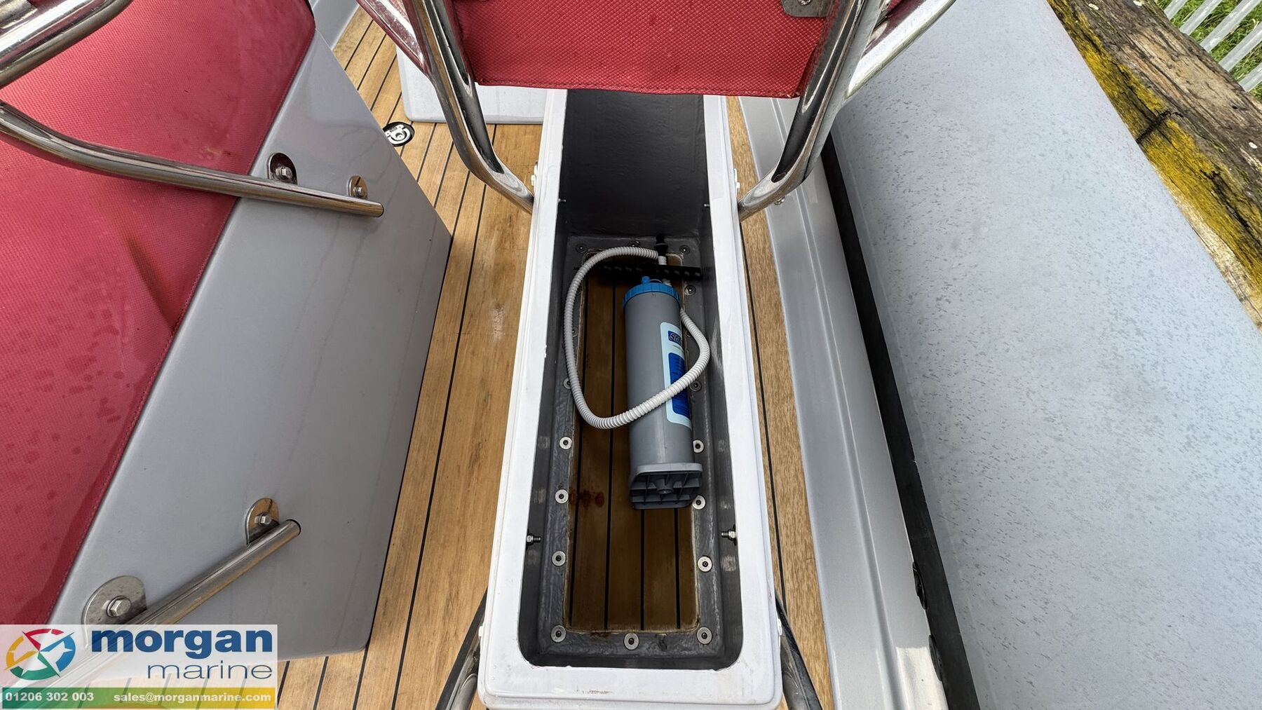 Electronics: Raymarine chart plotter. Garmin VHF radio. Fusion audio system with speakers. Yamaha digital engine display. Navigation lights. Anchor light. LED deck lights. Compass. Automatic and manual bilge pump. Isolator switch. Switch panel on dash.