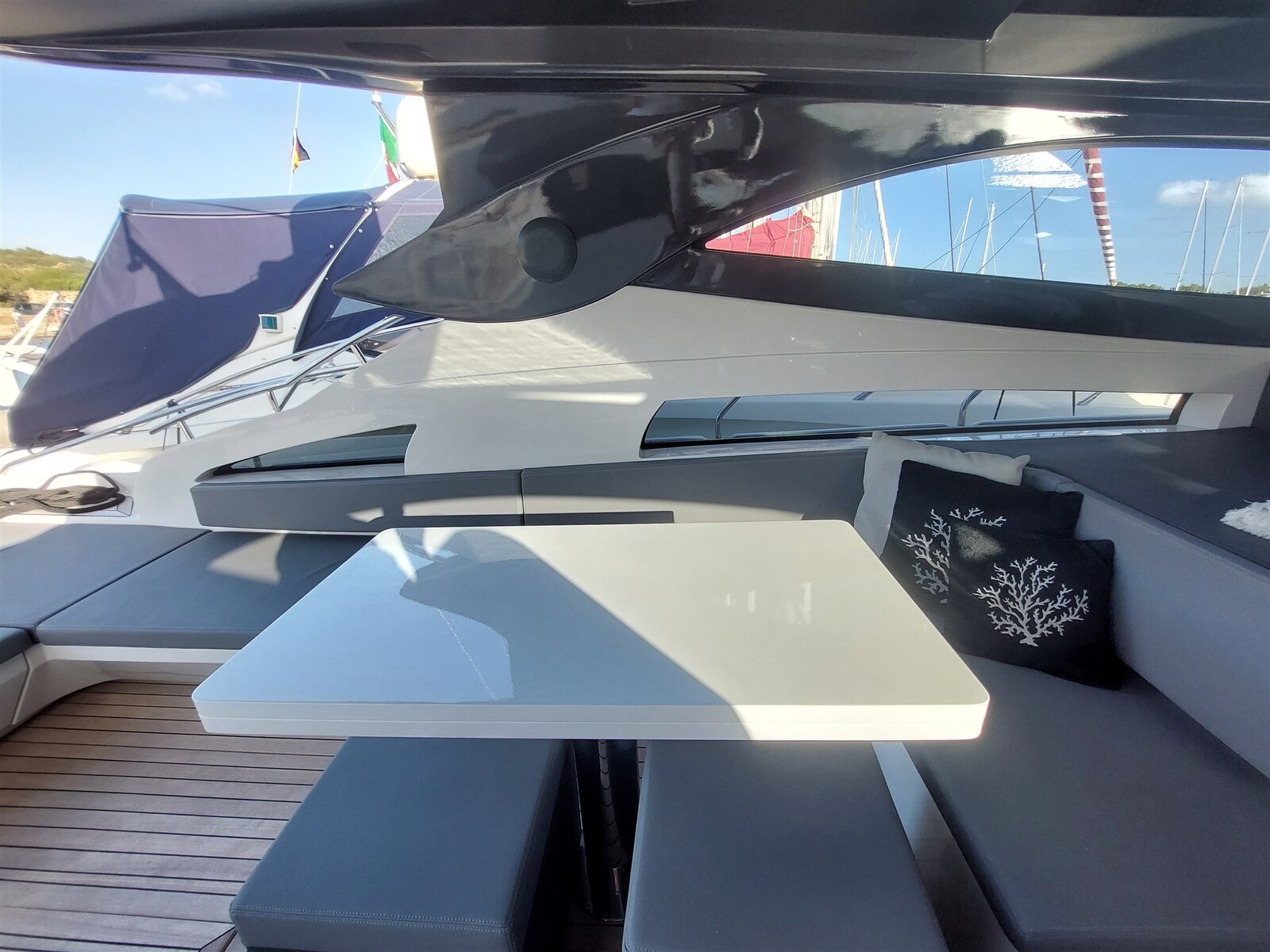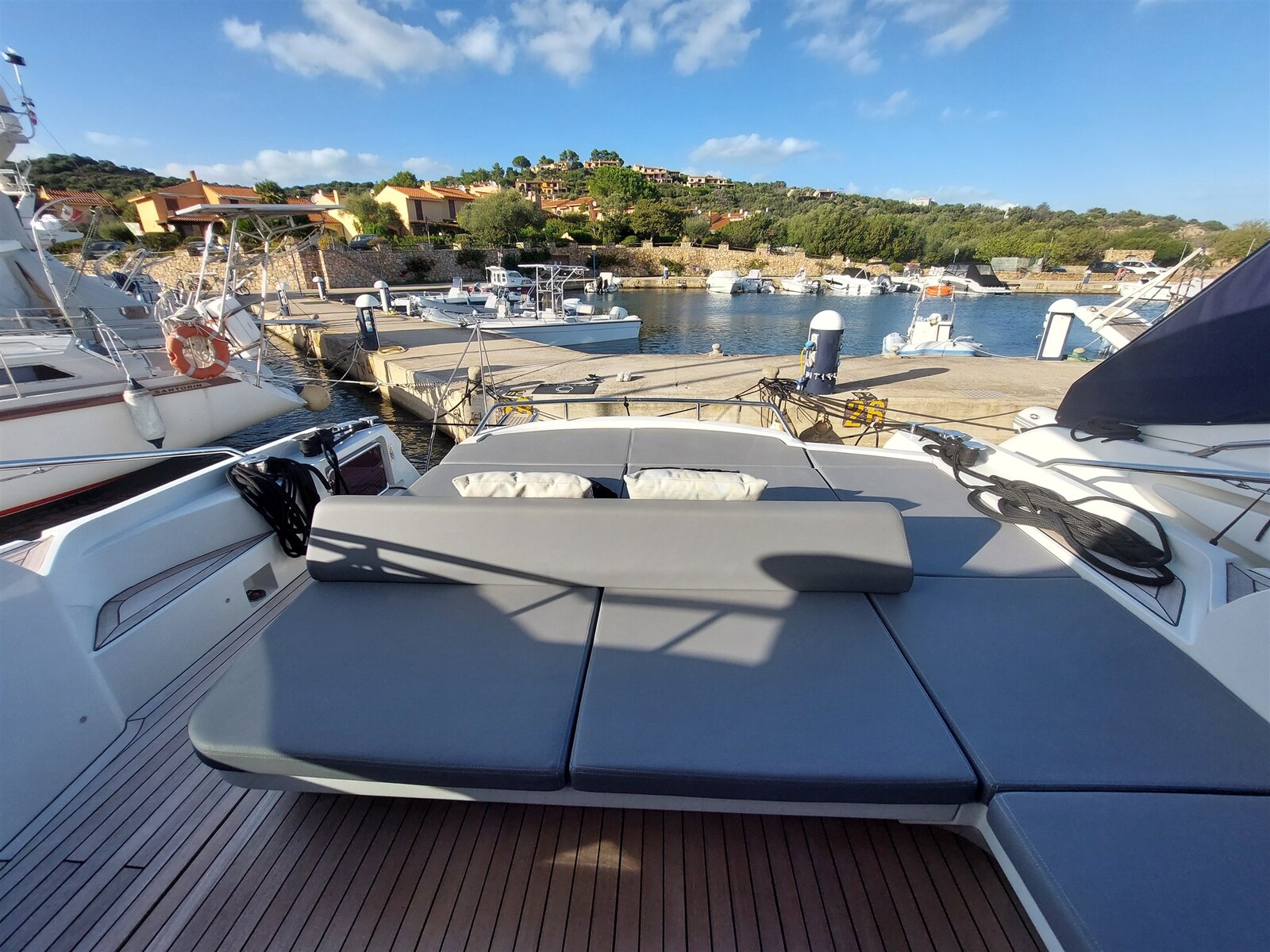 Gas Alarm, 2 Motoralarm, Bilgealarm, Wechselstromgenerator, Druckwasserpumpe, Batterien (New 2025), Teak auf Laufdecks, Batterieladegerät (Victrom), Landstromkabel, Reling, Cockpitdusche, Suchscheinwerfer, 2 Trimmklappen hydraulisch, Hardtop, 2 Trimmklappen Anzeigen, Ketten-Waschanlage, Waschbecken im Cockpit, Nachtbeleuchtung, Unterwasserbeleuchtung, Außenbordmotor für Beiboot, 6 Fender, Gangway (Opacmare eletroidraulica a scomparsa), Plattform, Abwassertank-Abflusspumpe, 4 automatische Bilgepumpe, Teakdeck, Eingangstür, Teak im Cockpit, Landanschluß, Wasseranschluss, elektrische Ankerwinde, Badeleiter, Cockpittisch, Beiboot (2.20), Signalhorn, T-Top, Verholwinde auf dem Achterdeck, Verholwinde auf dem Vordeck.