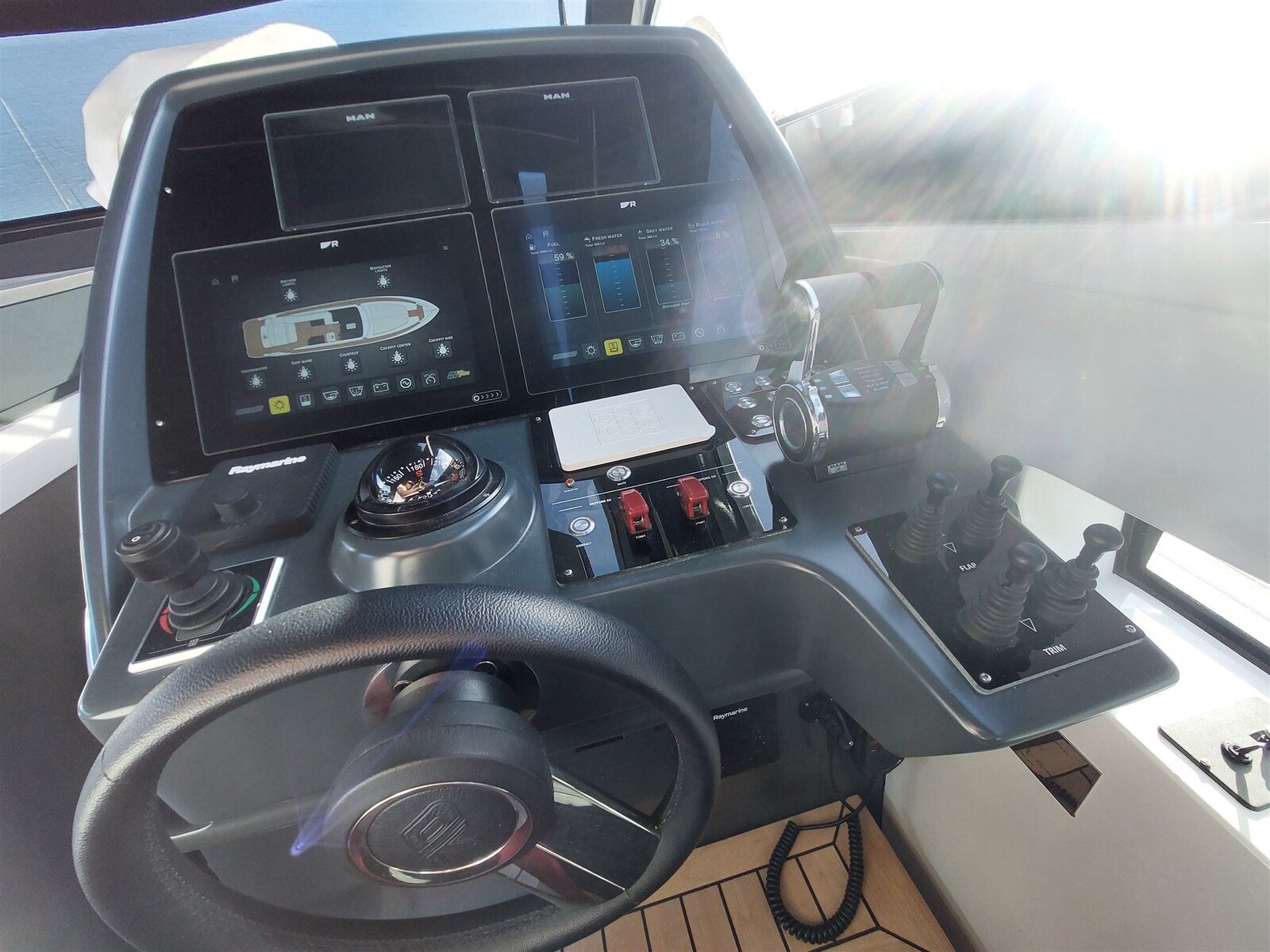 Angolo barra, Bussola (Artica), 2 Comando motori elettronico (Man), 2 Computer di bordo (Man), Contametri catena (Raymarine), Contamiglia (Raymarine), Cronometro (Raymarine), 2 Display (Raymarine), Ecoscandaglio (Raymarine), GPS (Raymarine), 2 Joystick (Elica di prua e poppa), 2 Monitor dei consumi (Man), Pilota automatico (Raymarine), Plotter con antenna GPS (Raimarine), Quadro comandi, Radio VHF (Raymarine), Sedile Copilota.