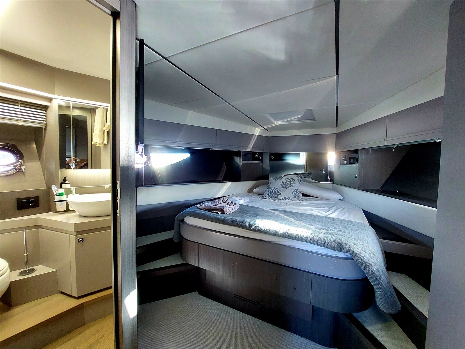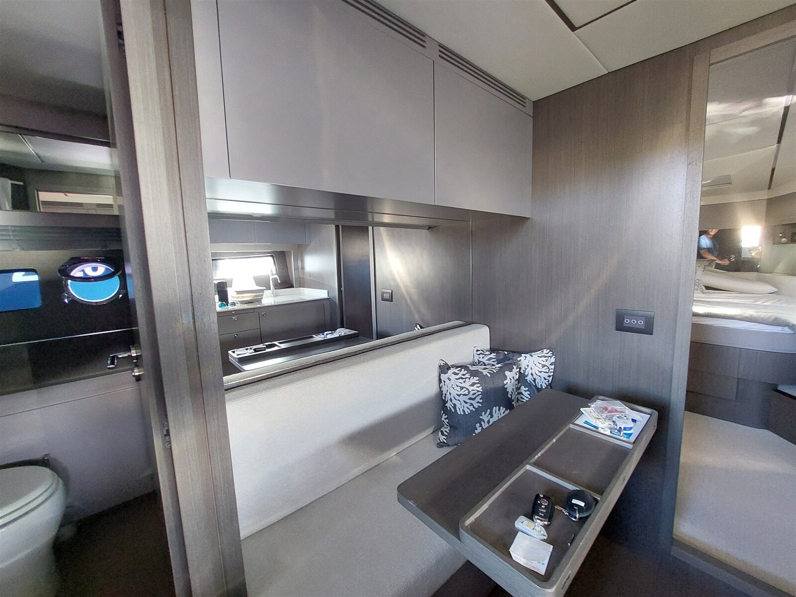 Pantry, Kühlschrank an Deck, Eisbox, Eiswürfelbereiter, Spülmaschine, Mikrowelle (Combi), Elektrische Kochplatte.