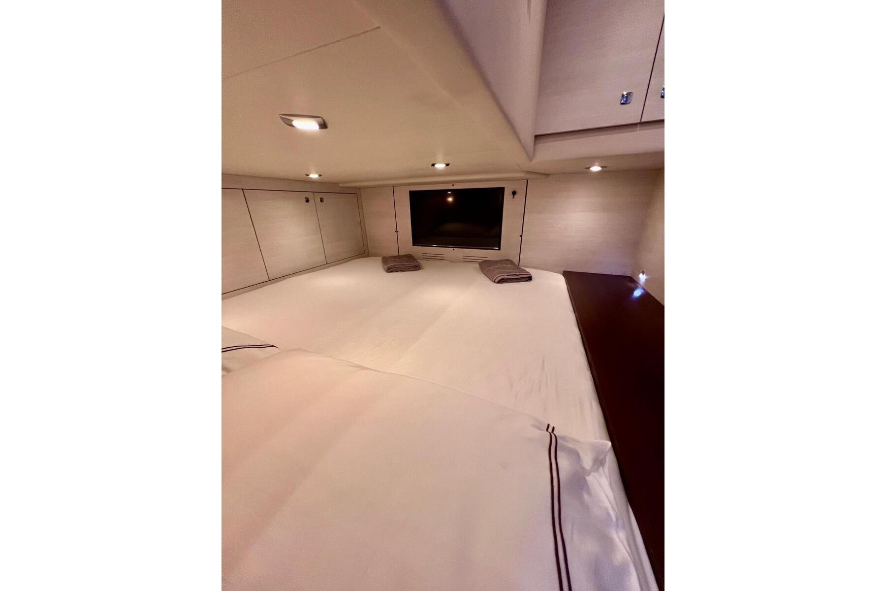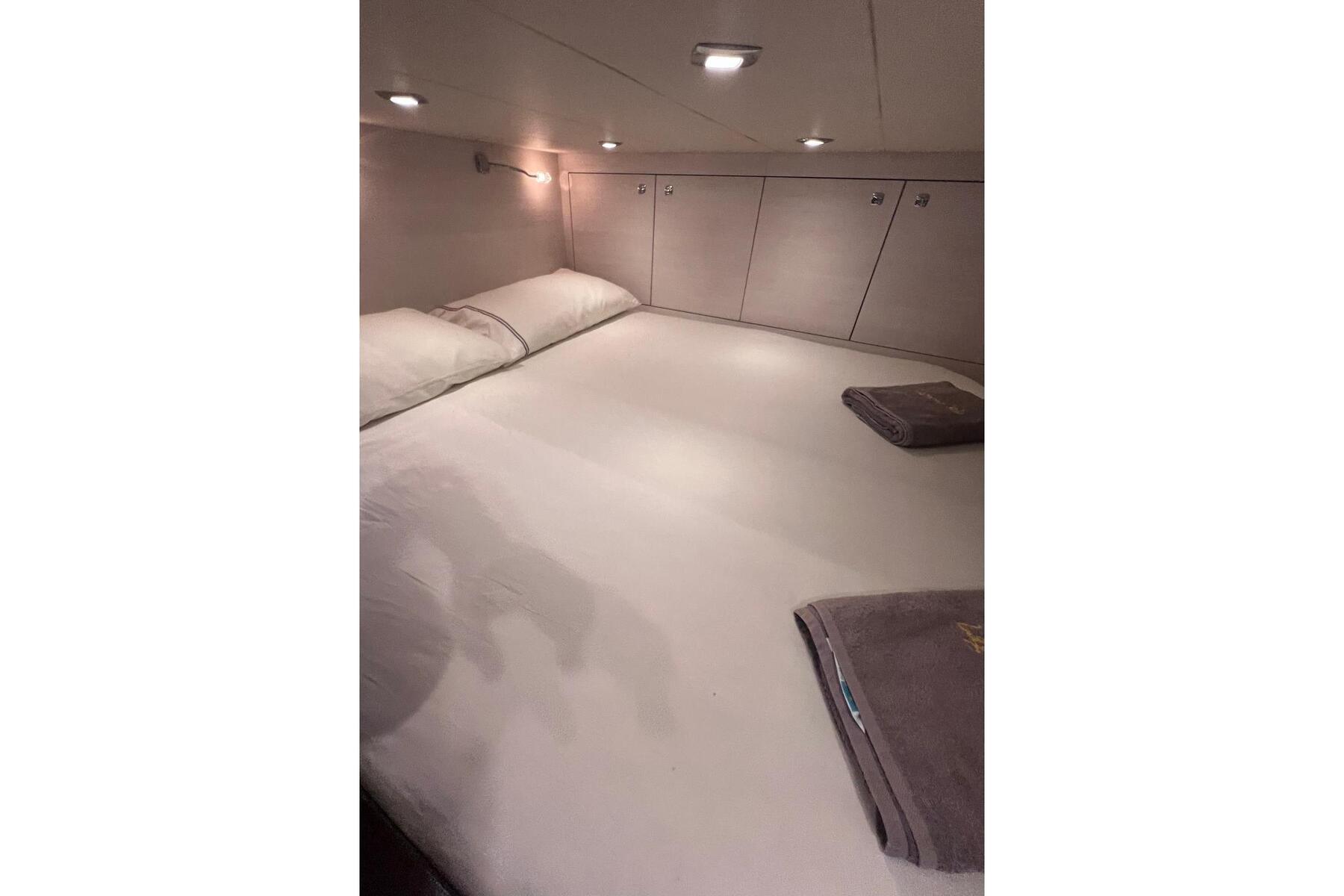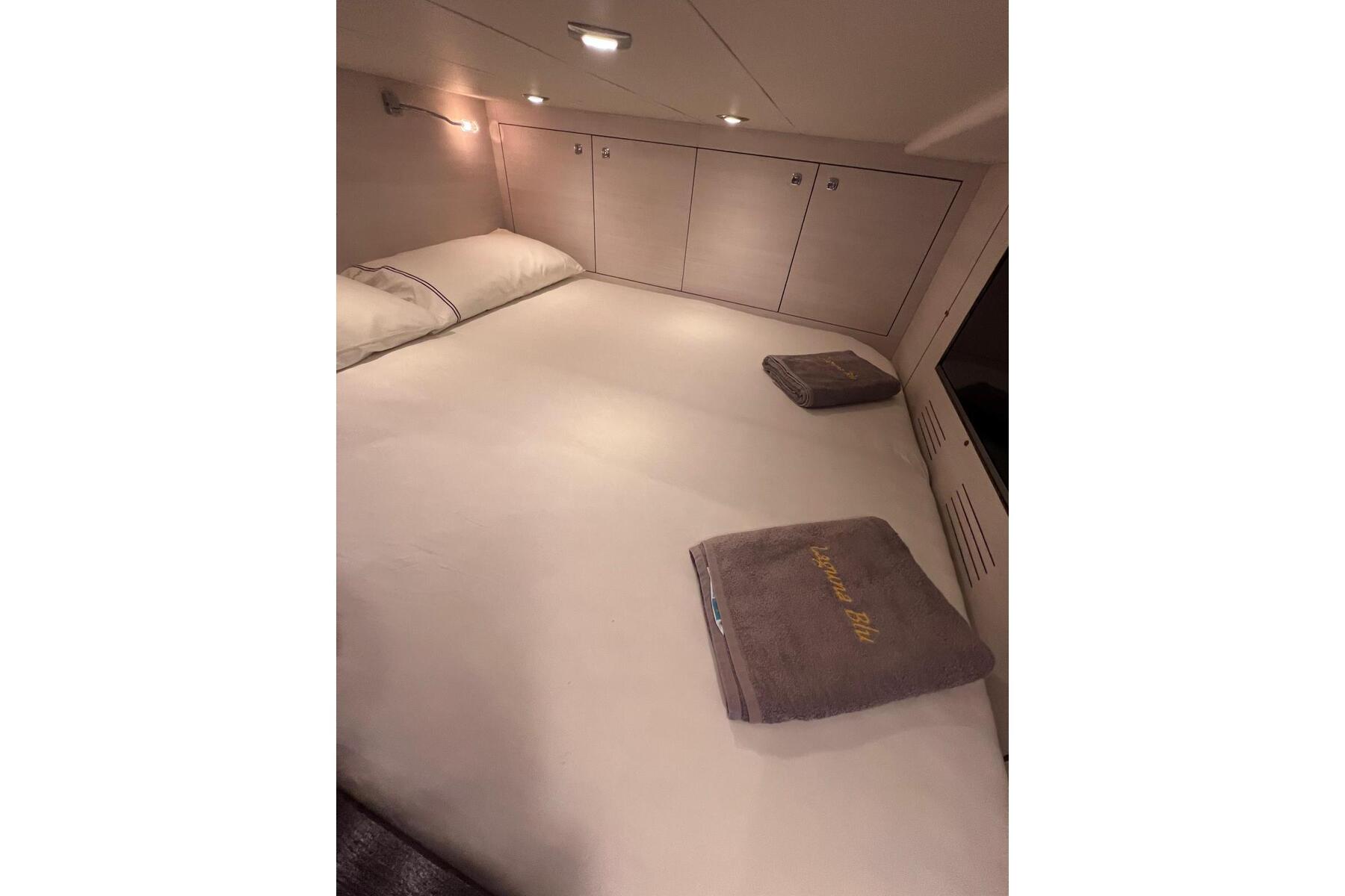 Interior consists of forward master cabin with generous closets and storage rooms; aft cabin with double bed on floor; Dinette with table that converts to bed; separate bathroom room with electric toilet and shower stall; galley room with dishwasher, refrigerator, oven, sink, custom cabinetry for dish service.