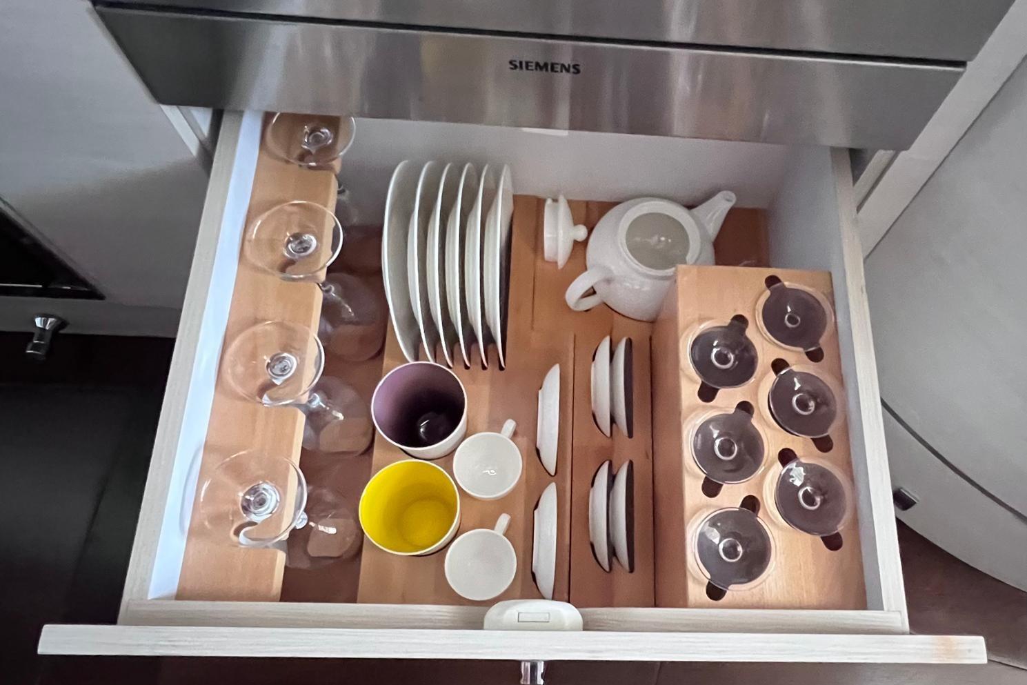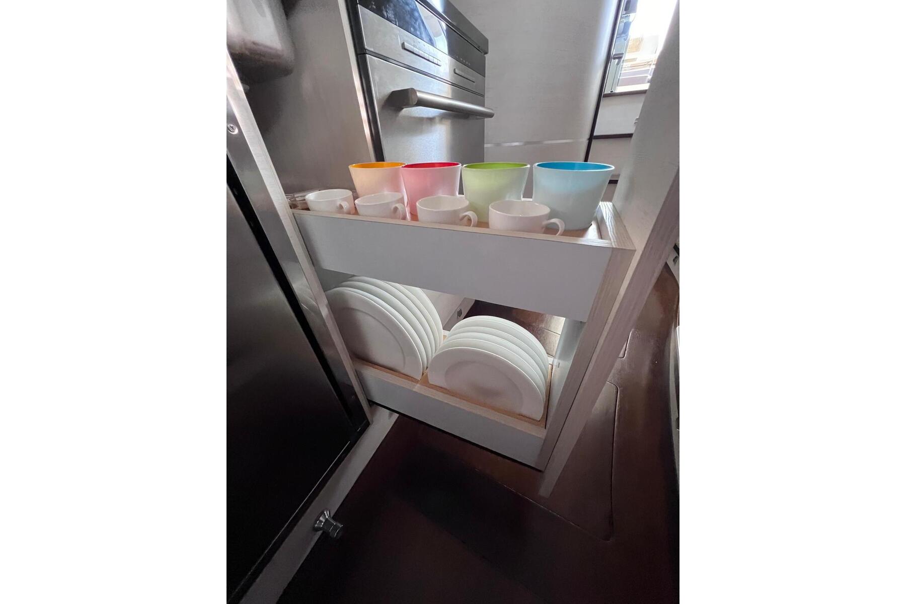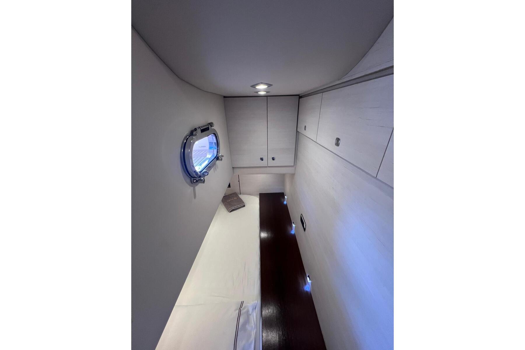 Interior consists of forward master cabin with generous closets and storage rooms; aft cabin with double bed on floor; Dinette with table that converts to bed; separate bathroom room with electric toilet and shower stall; galley room with dishwasher, refrigerator, oven, sink, custom cabinetry for dish service.